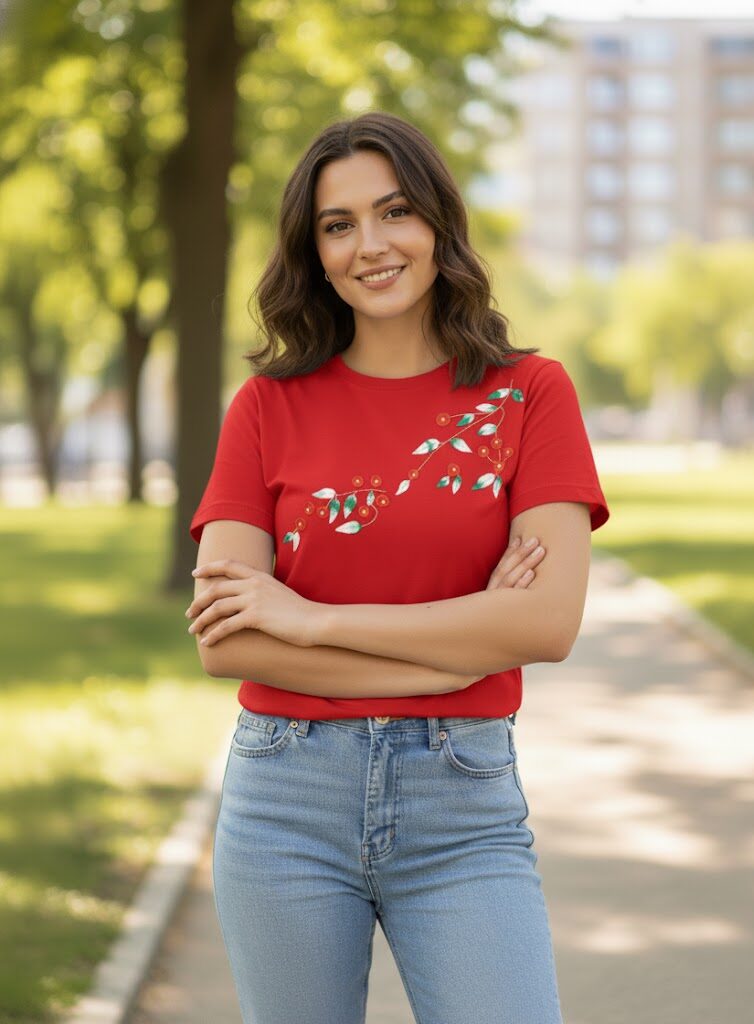 Add a refreshing pop of colour to your wardrobe with the Blossom Cotton T-Shirt. Made from premium 100% cotton, this tee is soft, breathable, and designed for all-day comfort. The striking fabric is highlighted with a delicate floral vine design featuring blossoms and leaves, creating a graceful yet casual appeal. Perfect for styling with jeans, shorts, or skirts, this versatile t-shirt is ideal for casual outings, weekend wear, or even a relaxed office look. Its balance of comfort and elegance makes it a go-to choice for effortless dressing.