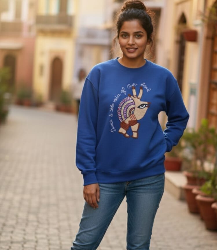 Step into comfort and creativity with this Boho Soul Art Embroidered Sweatshirt. Made from soft, breathable, and warm fabric, this sweatshirt keeps you cozy while adding a bold artistic touch to your outfit. The beautifully embroidered bohemian design at the front brings together rich patterns, expressive colours, and an inspiring quote — “Dance is the voice of our soul.”