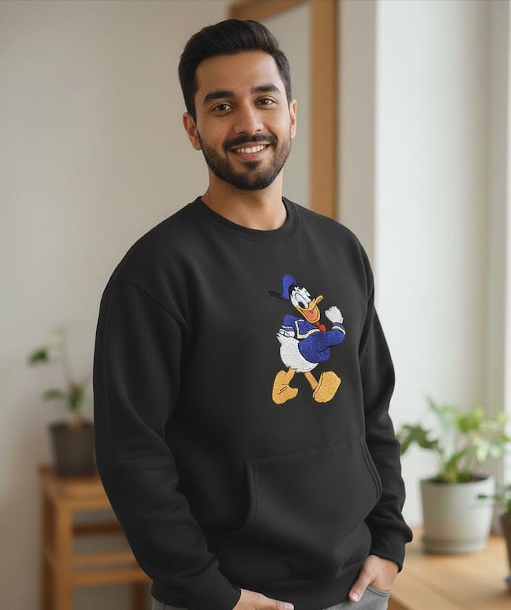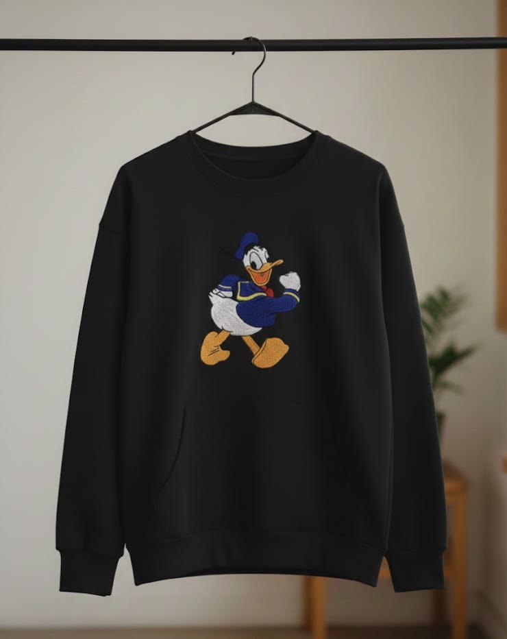 A cozy black sweatshirt featuring an adorable hand-embroidered cartoon duck design, perfect for everyday casual style.