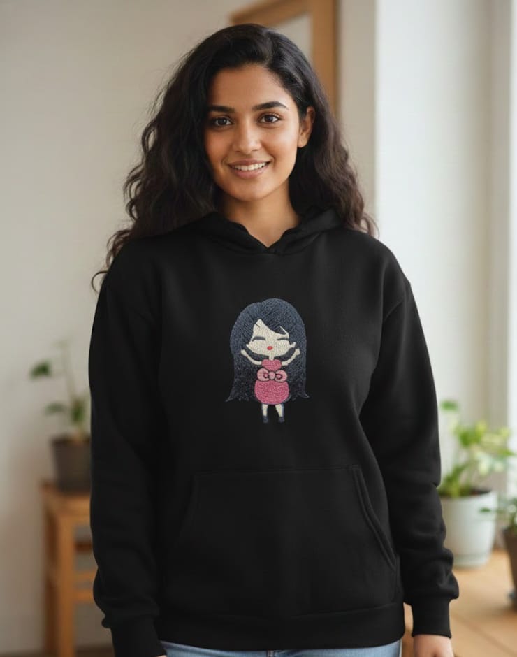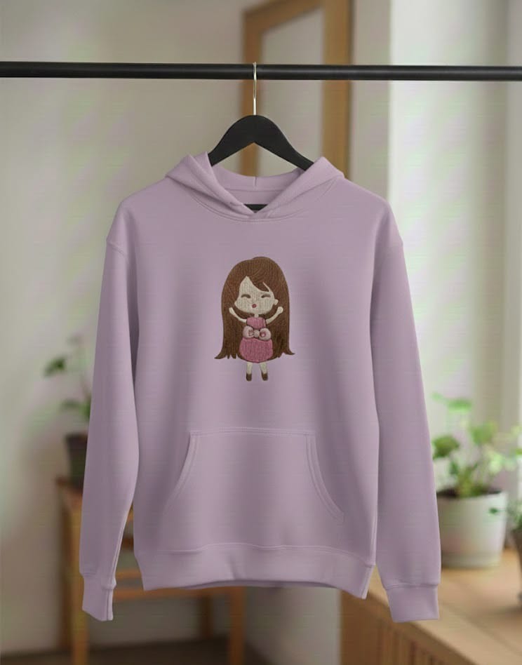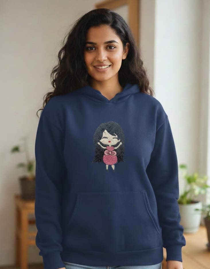 Add a dose of sweetness to your wardrobe with this Cute Doll Embroidered Hoodie. Designed for comfort and style, this hoodie features a charming hand-embroidered doll motif that gives it a warm, playful, and aesthetic look. Made from premium-quality fabric, it feels soft on the skin and keeps you cozy all day long.