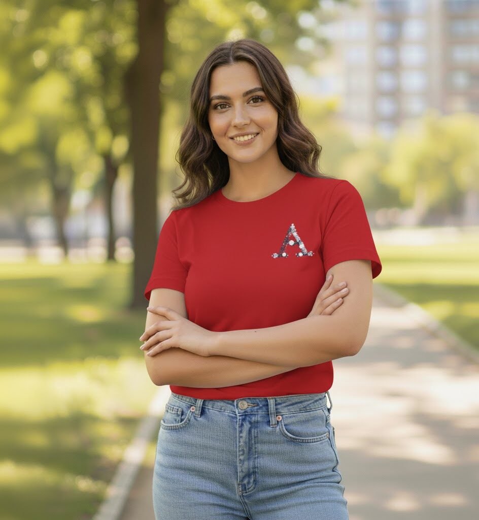 This beautiful Red T-Shirt is both stylish and comfortable. The elegant floral embroidery with the “A” initial design on the front makes it truly unique. Made with soft cotton fabric, it is perfect for everyday wear and also a great gifting option.