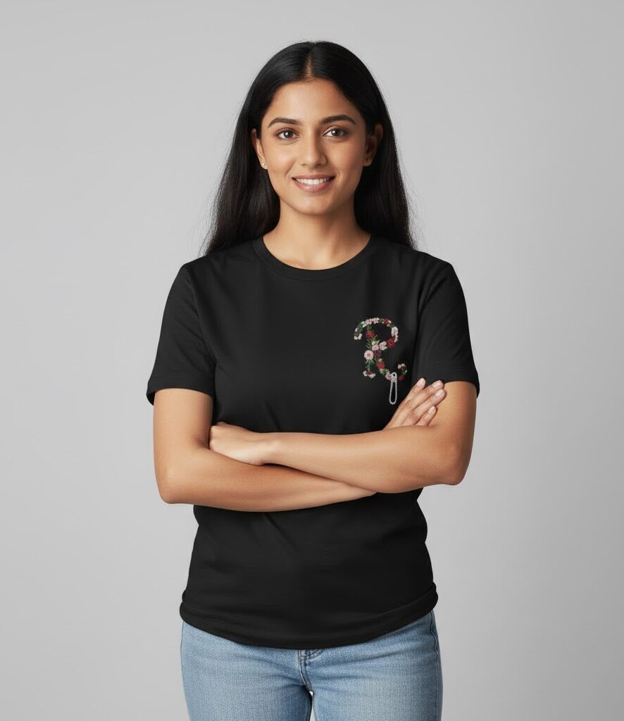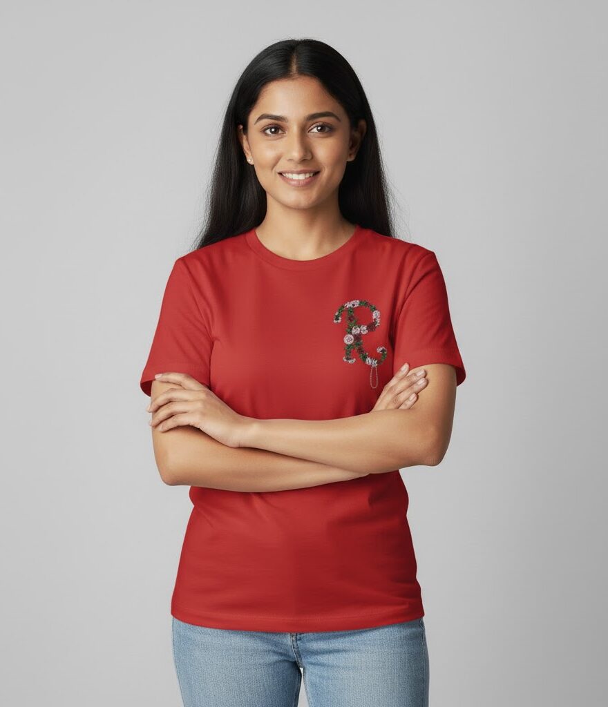 Add a touch of elegance with this Floral Initial “R” Embroidered T-Shirt, featuring vibrant multi-colour threadwork. Perfect for a personalized, stylish everyday look.