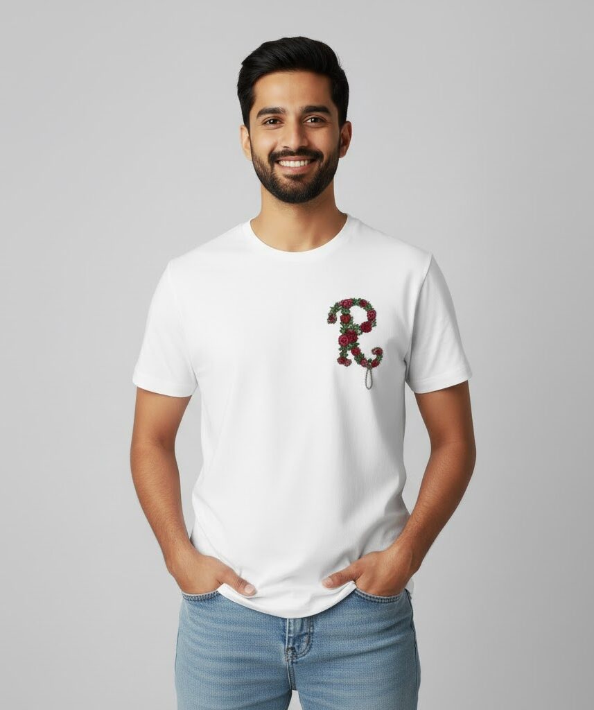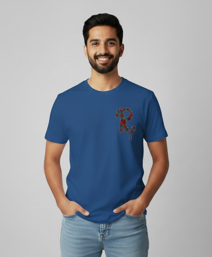 Bring colour and charm to your wardrobe with this beautifully embroidered “R” initial T-shirt, featuring a vibrant mix of floral threads. Each stitch adds a touch of artistry, making it perfect for those who love personalized and elegant styles.