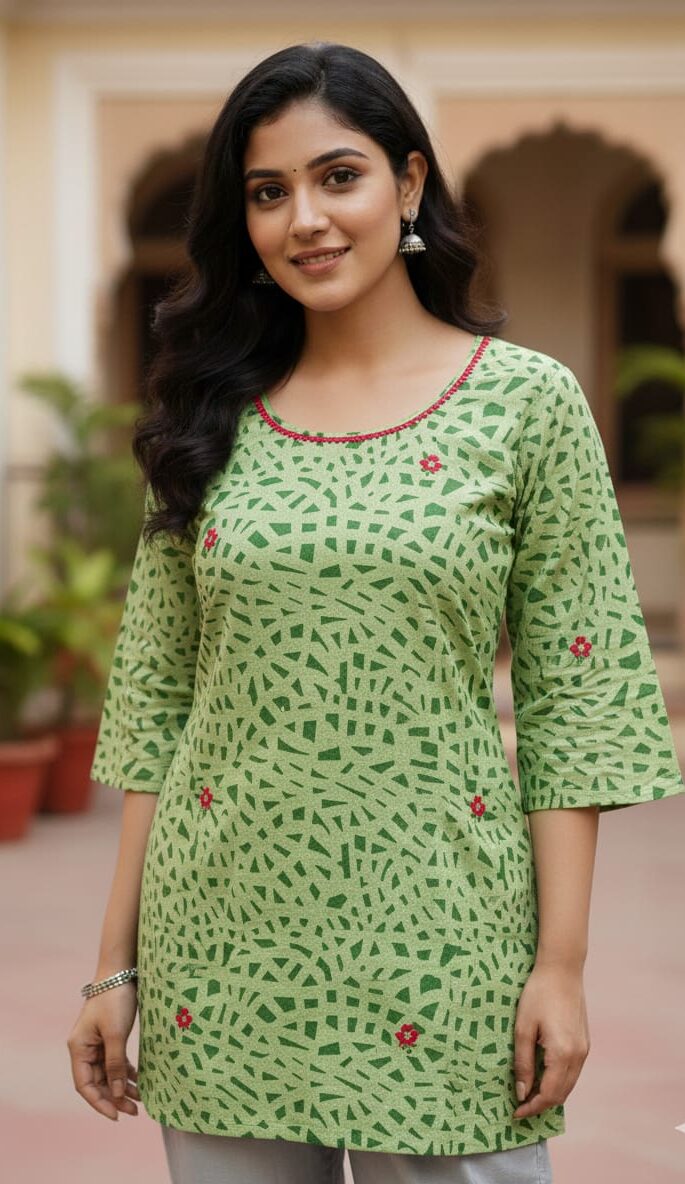 A contemporary take on traditional style! This Green Geometric Print Short Kurti is made from pure juteand features intricate floral embroidery on the neck. Effortlessly chic for college, errands, or casual daytime events.