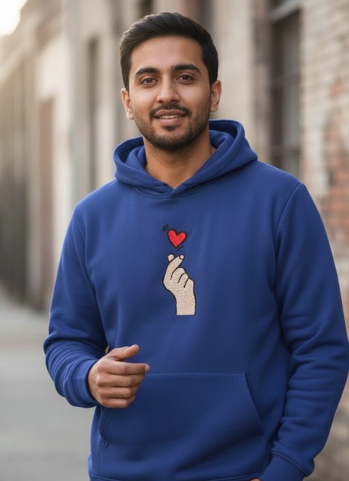 Wrap yourself in comfort and charm with this Minimal Heart Gesture Embroidered Hoodie. Crafted from premium soft fleece fabric, this hoodie offers warmth, durability, and a relaxed fit ideal for daily wear. The highlight of the design is the elegant embroidered hand forming a heart gesture — a symbol of affection, warmth, and positivity.