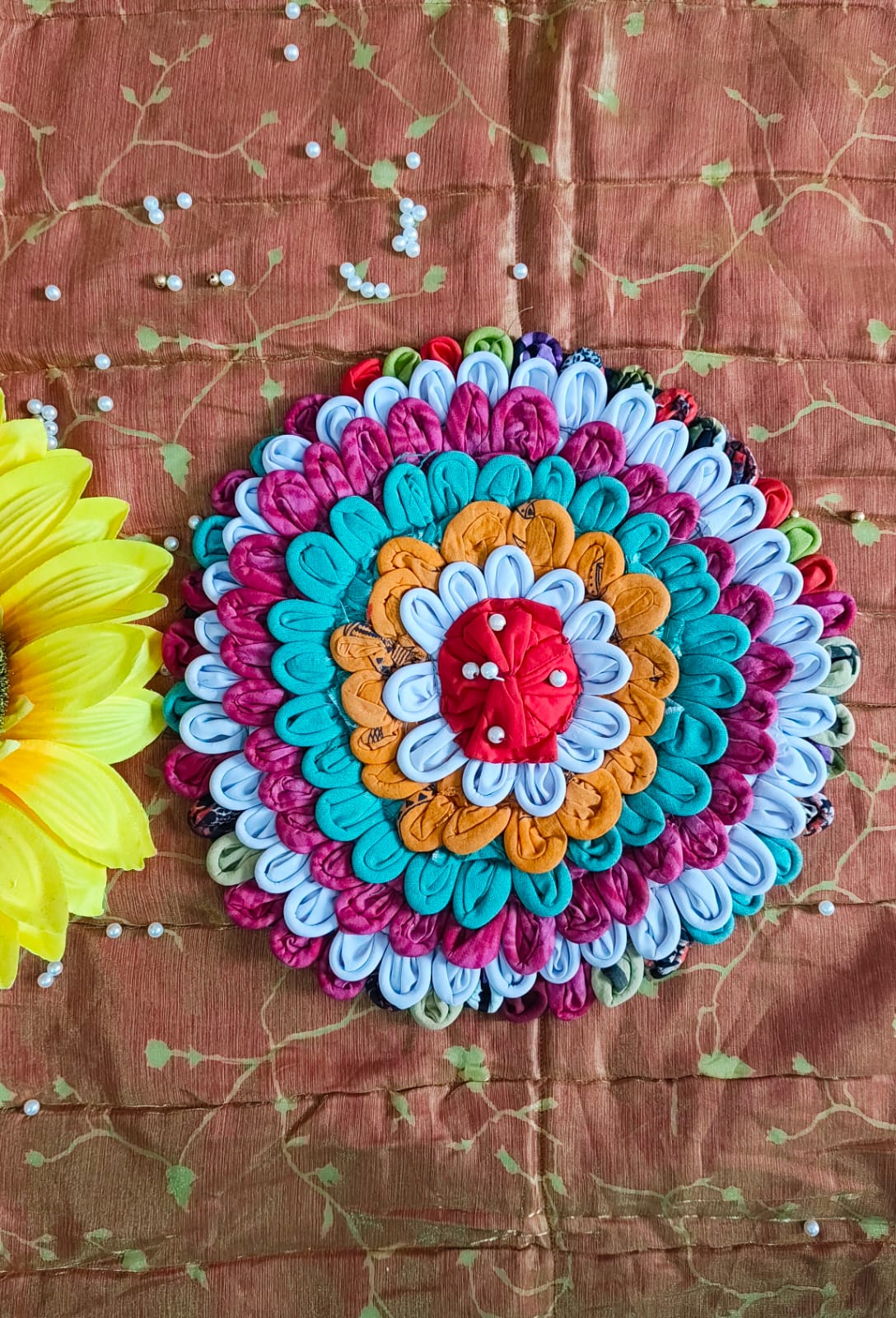 This beautiful handcrafted fabric pooja carpet is designed with colorful, petal-like fabric layers and pearl embellishments, forming a vibrant floral pattern. Ideal for placing idols, kalash, or diya during poojas, festivals, and rituals. Lightweight, reusable, and easy to maintain, it adds a traditional touch to your spiritual space.
