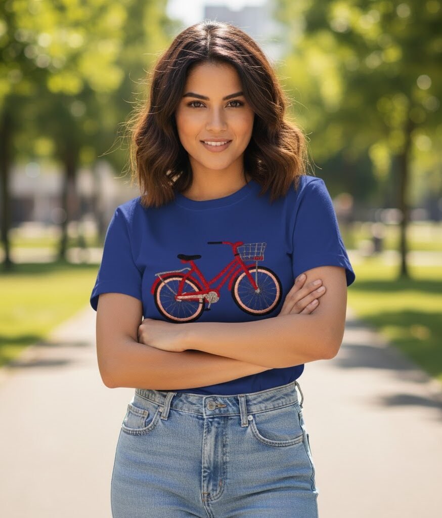 The highlight of this t-shirt is the detailed bicycle embroidery, complete with a front basket and intricate wheel stitching, giving it a unique and eye-catching look. The embroidery adds a playful yet classy vibe, making it suitable for casual outings, friendly meetups, or even as a gift for cycling enthusiasts.