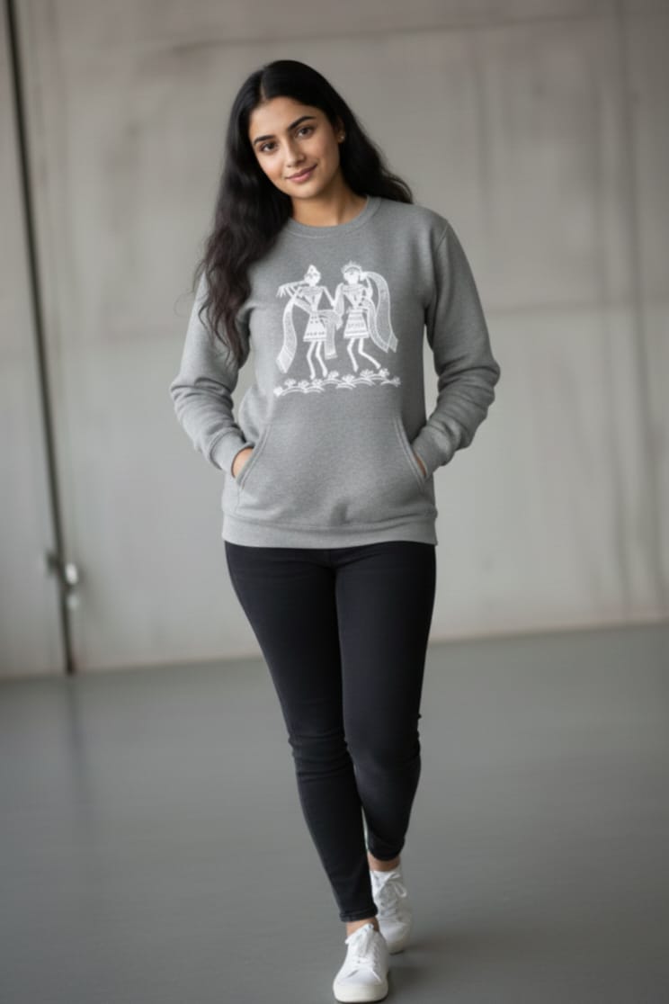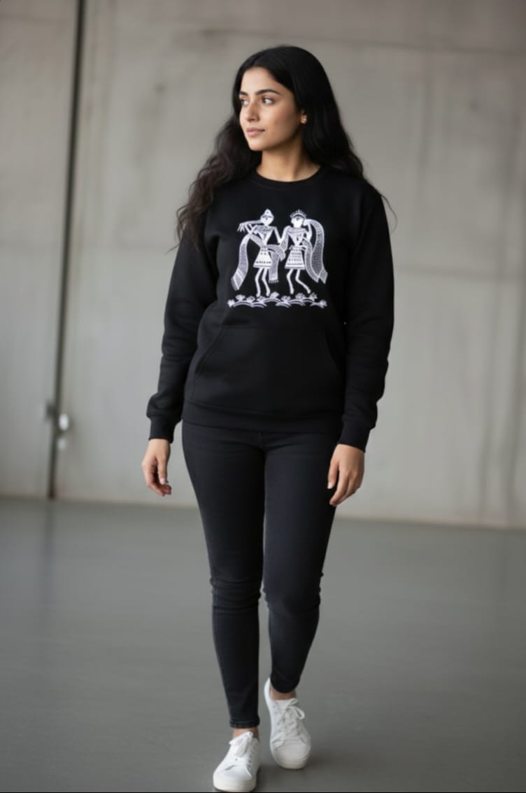 Traditional Warli art inspired sweatshirt, featuring elegant tribal motifs that blend heritage with modern comfort.